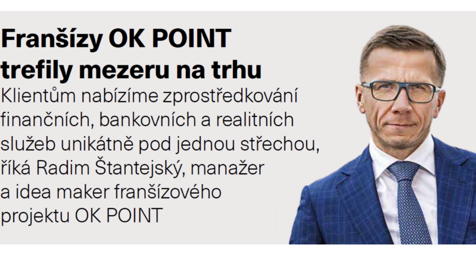 Zajímavou nabídku propojení bankovních, finančních a realitních služeb nabízí společnost Broker Consulting v rámci franšízového projektu OK Point. „Unikátní je na českém trhu právě propojení těchto služeb, které poskytujeme klientům,“ říká v rozhovoru pro E15 Radim Štantejský, obchodní ředitel Broker Consulting a manažer projektu OK Point.